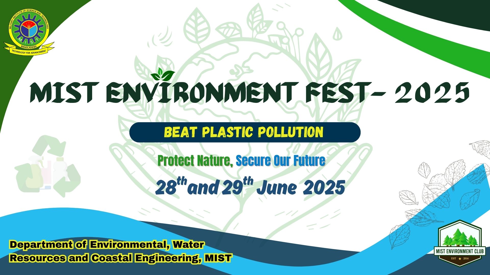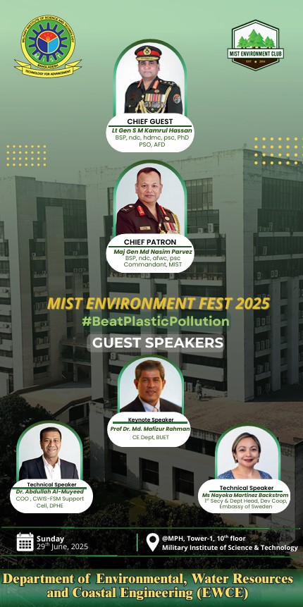 This year, the Department of EWCE, in collaboration with the MIST Environment Club, organized a two-day "MIST ENVIRONMENT FEST 2025" aimed at promoting environmental awareness and sustainable practices under the theme of "Beat Plastic Pollution". The event featured a range of activities, which were held on the 28th of June, including poster presentation, GIS case competition, Buzzer Blitz contest and environmental article writing, all designed to foster a deeper understanding of pressing environmental issues and innovative solutions. This joint effort reflects the department's continued commitment to education, community engagement, and environmental stewardship. On the following day of the event on 29th of June, The Head of the Department extended a warm welcome to everyone from various sectors at MIST Environment Fest 2025. Lt Gen S M Kamrul Hassan, Principal Staff Officer of the Armed Forces Division, attended as the chief guest and expressed the urgency of environmental protection and tackling plastic pollution. A key highlight of the fest was the keynote session, delivered by Dr. Md Mafizur Rahman from BUET, who discussed global efforts to combat plastic pollution. The event also featured technical sessions that addressed some of today’s most critical environmental challenges. Dr. Abdullah Al-Muyeed from the Department of Public Health Engineering (DPHE) shed light on Bangladesh’s sanitation issues, while Nayoka Martinez Bäckström from the Embassy of Sweden emphasized the importance of empowering youth leadership in the face of climate change and environmental uncertainty. In the closing remarks, Maj Gen Md Nasim Parvez, BSP, ndc, afwc, psc, Comdt, MIST, and Chief Patron of the event, highlighted the importance of enhancing public understanding and promoting the adoption of alternatives to plastic to tackle the environmental issues associated with the global climate crisis.