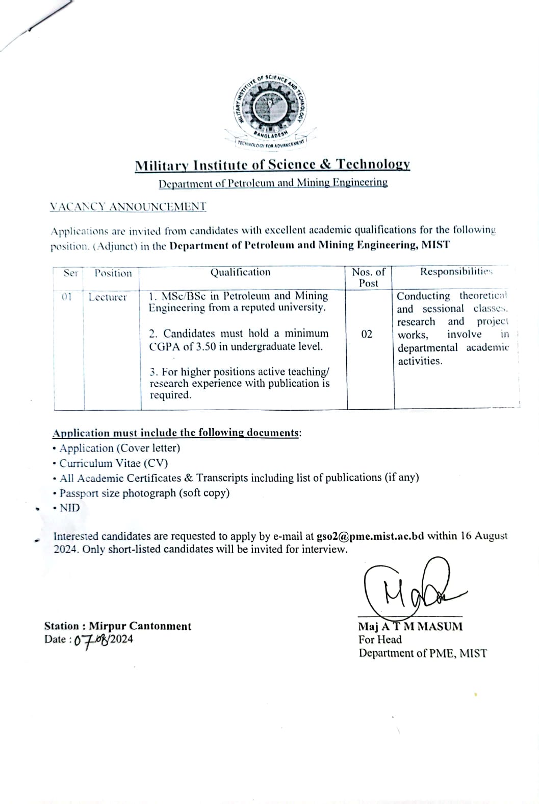 A Level - MIST Admission Notice