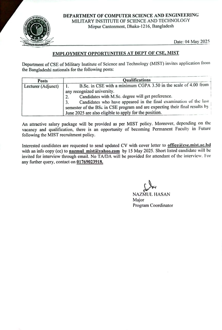 Employment Opportunity at CSE Dept, MIST